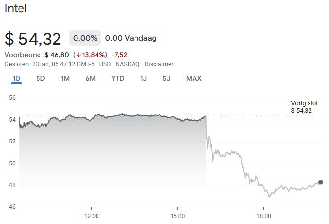 De S&P 500-futures daalden vrijdag met 0,2 procent. Daarmee lijkt een tweede wekelijkse verlies op rij onafwendbaar, iets wat sinds juni niet meer is voorgekomen. De hoofdschuldige? Intel. Het aandeel kelderde in de voorbeurshandel met dertien procent, nadat het bedrijf beleggers teleurstelde met zwakke verwachtingen voor de rest van het jaar.