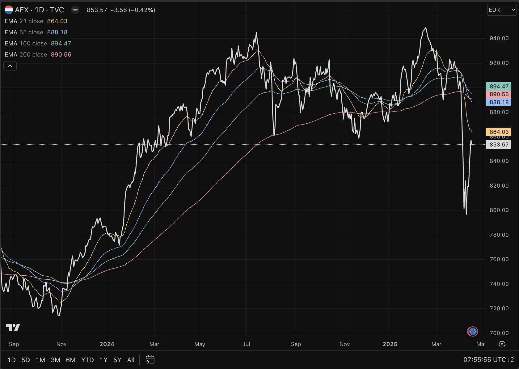 Om het positieve momentum te herpakken moet de AEX koers een aantal hordes overwinnen. De eerste is het 21-daagse exponentiële bewegende gemiddelde (oranje), die momenteel op 864 punten ligt.