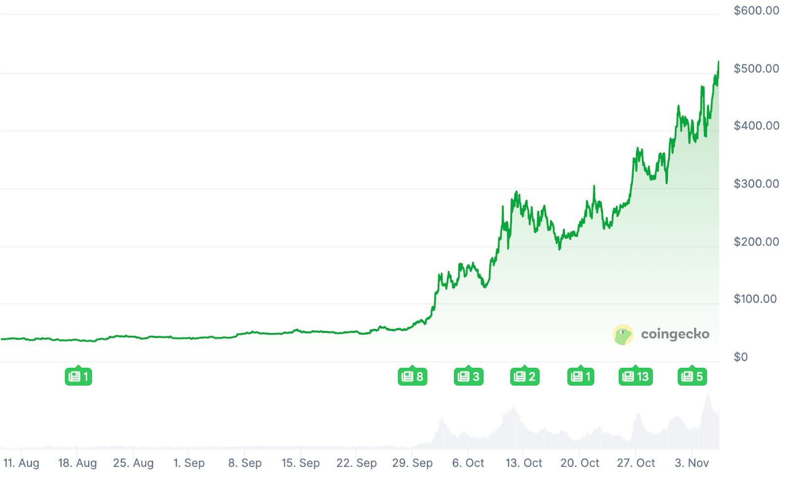 Als we bij Zcash nog wat verder uitzoomen, worden de prestaties nog indrukwekkender. In de afgelopen drie maanden is het project met maar liefst 1.250 procent gestegen. Met een koers van 521 dollar bereikte de digitale munt zijn hoogste waardering in bijna acht jaar tijd.
