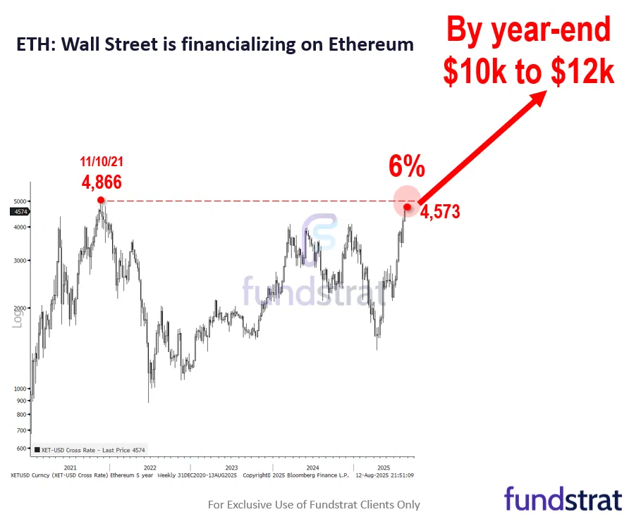 Daarnaast groeit de interesse vanuit Wall Street. Tom Lee van Fundstrat stelt dat ETH kan stijgen tot $12.000 en noemt het “de deal van het decennium.” Hij verwijst naar de GENIUS Act en andere financiële wetgeving die stablecoins en blockchain-infrastructuur stimuleert – waarvan veel op Ethereum draait.