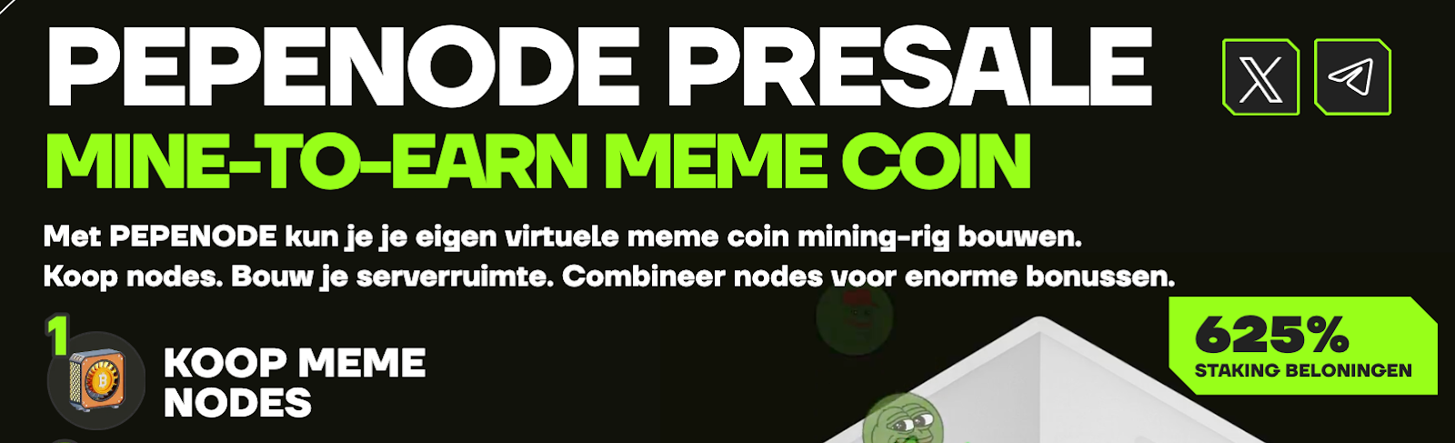 Pepenode is een van de meest veelbelovende cryptomunten op dit moment. Het is een frisse wind op de meme coin markt. De presale bevindt zich nog in een vroege fase, maar heeft al meer dan $2 miljoen opgehaald. Wie op tijd instapt kan profiteren van het lage instaptarief en de aantrekkelijk hoge staking beloningen. De staking beloningen zullen naarmate het project vordert dalen, terwijl de prijs per token juist stijgt.