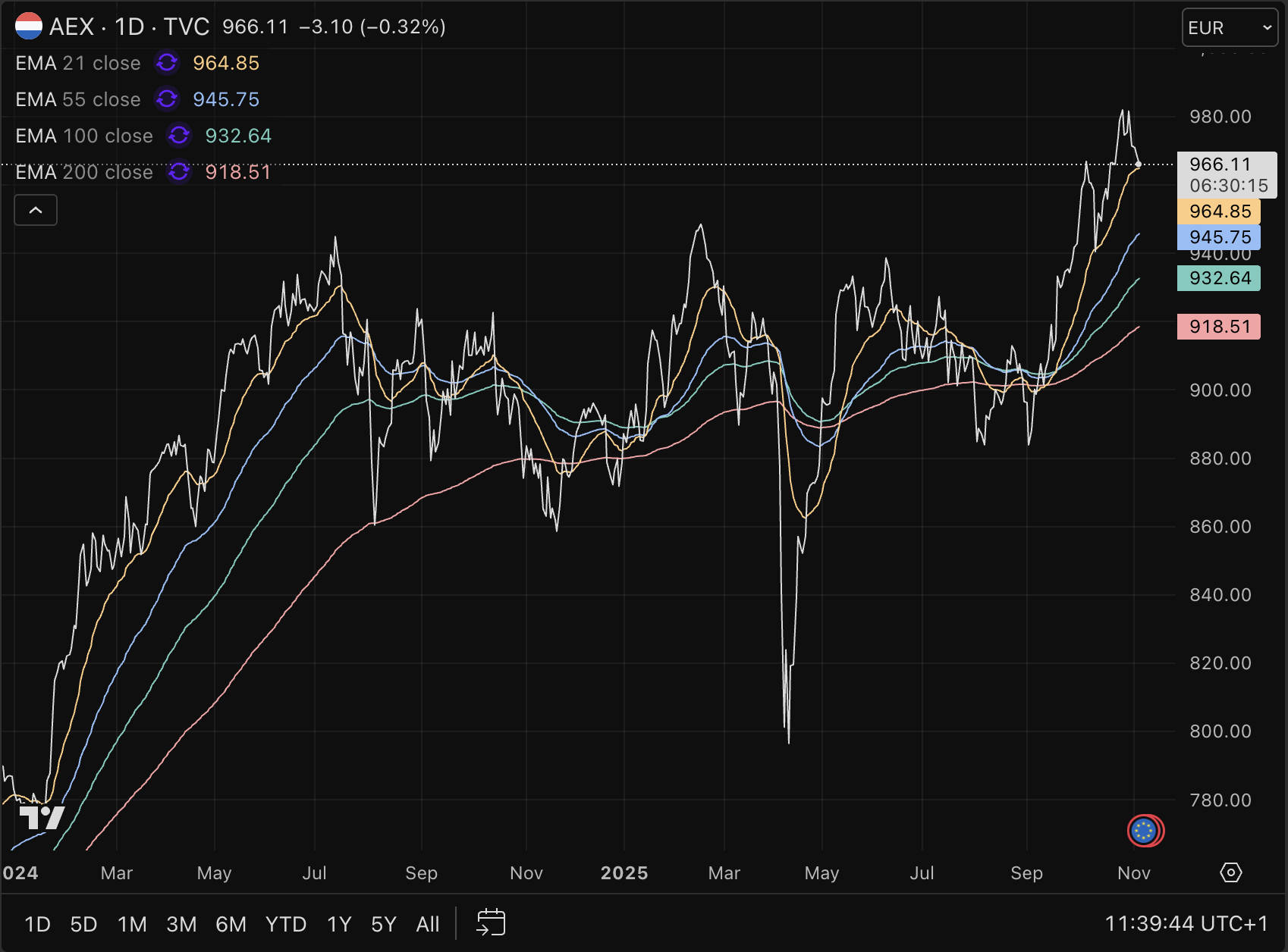 Op dit moment lijkt de AEX steun te vinden op zijn 21-daagse exponentiële bewegende gemiddelde (geel).