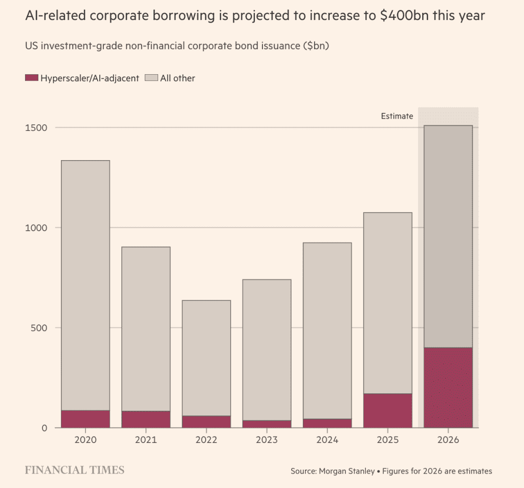 De hyperscalers steken honderden miljarden dollars in datacenters, chips en energie-infrastructuur om hun AI-ambities waar te maken. Morgan Stanley schat dat deze bedrijven en aanverwante sectoren in 2026 zo’n 400 miljard dollar ophalen op de Amerikaanse high-grade obligatiemarkt. Ter vergelijking: in 2024 was dat nog maar 44 miljard dollar.