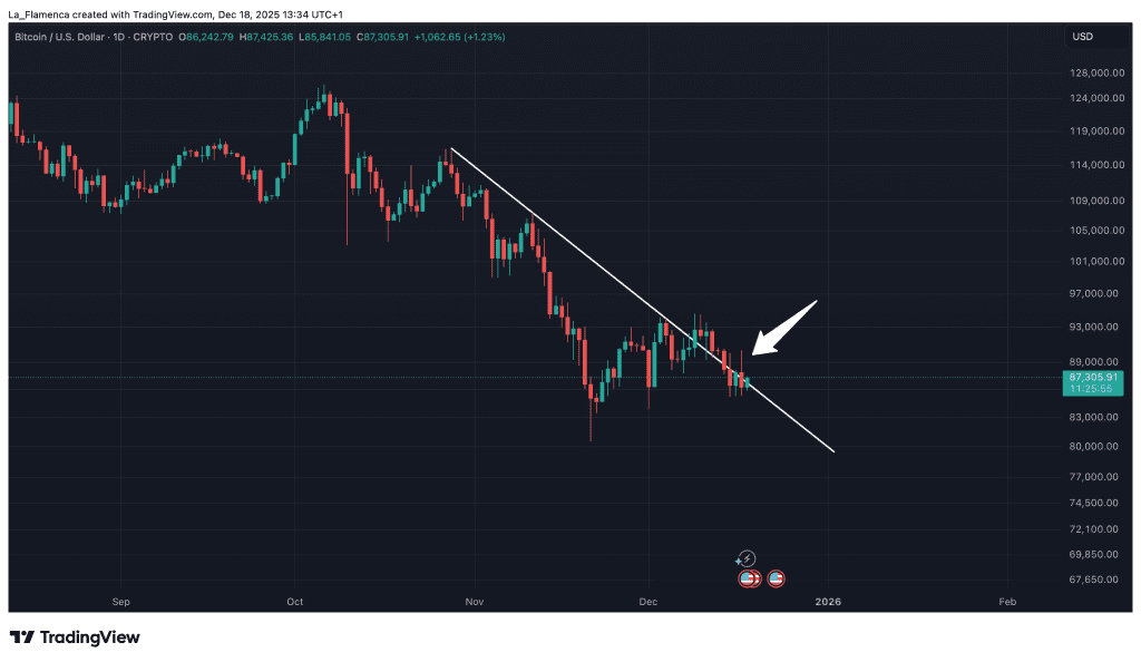 BTC/USD dagelijkse koersgrafiek met neerwaartse trendlijn. Bron: La_Flamenca via TradingView