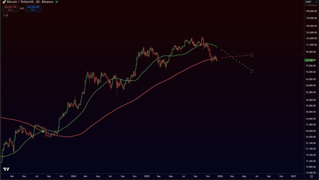 In de koersgrafiek van bitcoin is er nog een ander bearish (negatief) signaal te zien. Butcher deelt op X dat het gaat om de drie daagse koersgrafiek, waarin een belangrijke indicator op het punt staat een heel bearish signaal af te geven.