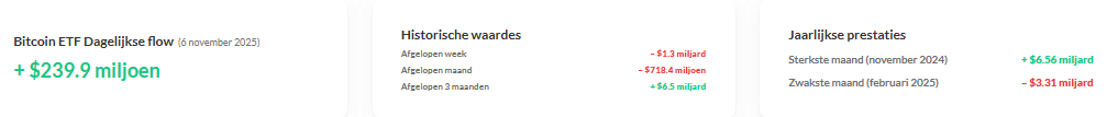 De Bitcoin koers had gisteren weer een hele slechte dag, maar daar zien we weinig van terug op de Amerikaanse aandelenbeurs. De grootste crypto werd 2,44 procent goedkoper, maar de spot-ETF’s haalden 239,9 miljoen dollar binnen.