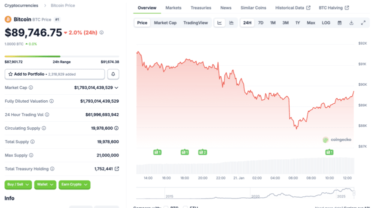 Bitcoin koers zakt in 24 uur door onrust op de markt.Bron: CoinGecko