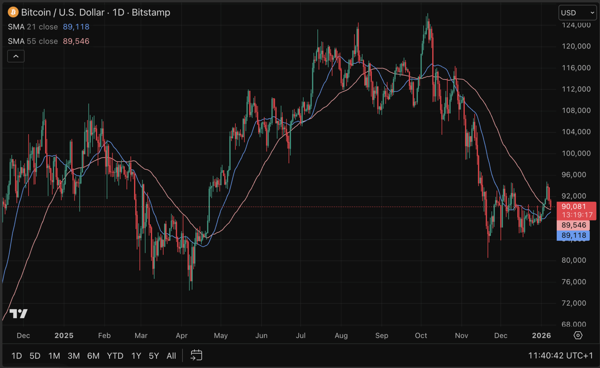 Tijdens de Aziatische handel daalde Bitcoin tot ongeveer 89.500 dollar. Daarmee kwam de koers dicht in de buurt van het 21-daags voortschrijdend gemiddelde, een technisch niveau dat door handelaren vaak wordt gezien als een scheidslijn tussen korte termijn sterkte en zwakte.