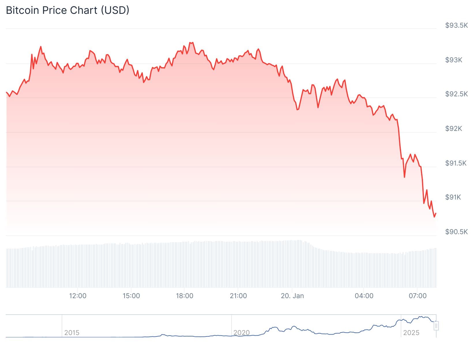 Bitcoin krijgt opnieuw een pak slaag. De spanningen tussen de Verenigde Staten en de Europese Unie, met Groenland als inzet, beginnen steeds zwaarder te wegen op de koers. De markt lijkt zich nu alvast schrap te zetten voor vanmiddag als de Amerikaanse aandelenbeurs voor het eerst sinds de escalatie open gaat.