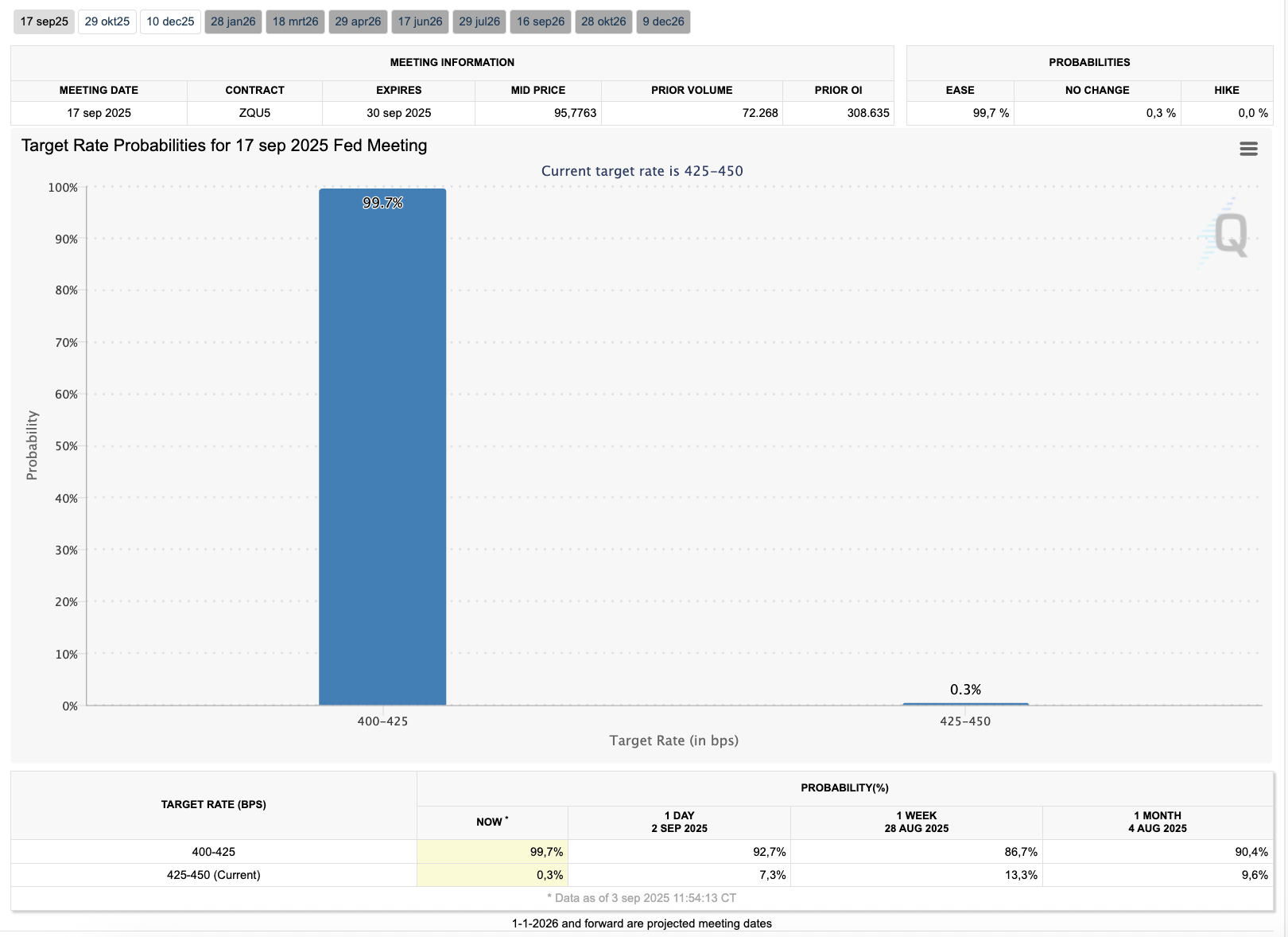 Aan het rentebeleid van de Amerikaanse centrale bank zal het in ieder geval niet liggen. De kans op een renteverlaging in september is inmiddels de 100 procent genaderd.