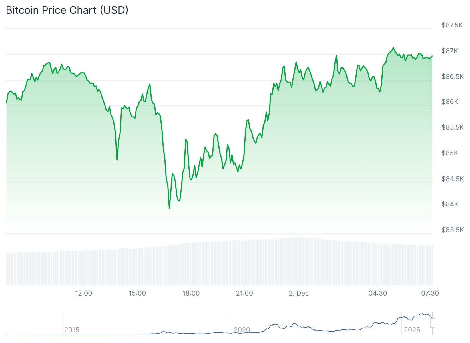 Maar de munt heeft best een tijdje goedkoper op de markt gestaan. Aan het einde van de middag werd een dieptepunt bereikt van zo’n 83.800 dollar. Inmiddels verschijnt 87.000 dollar alweer op de borden, wat een herstel van bijna 4 procent betekent.