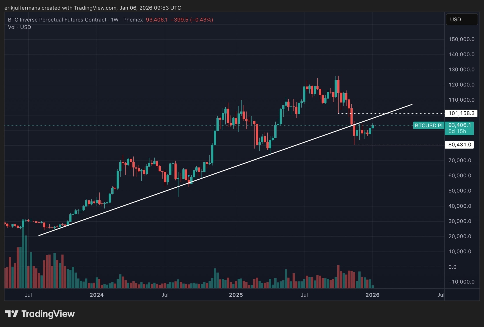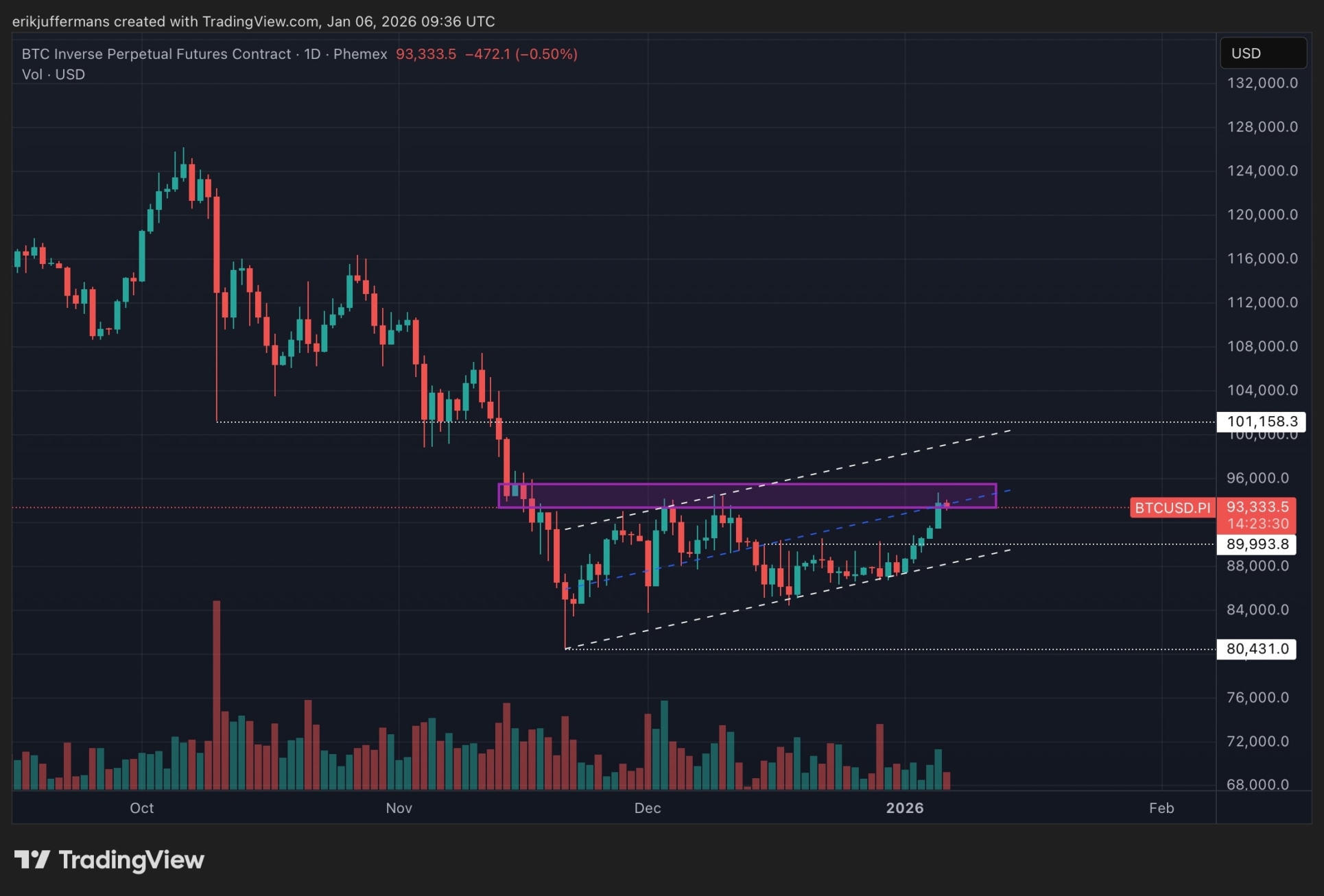 De Bitcoin (BTC) koers staat opnieuw tegenover het cruciale weerstandsniveau van 93.500 dollar. In december werd de munt hier nog twee keer resoluut afgewezen.