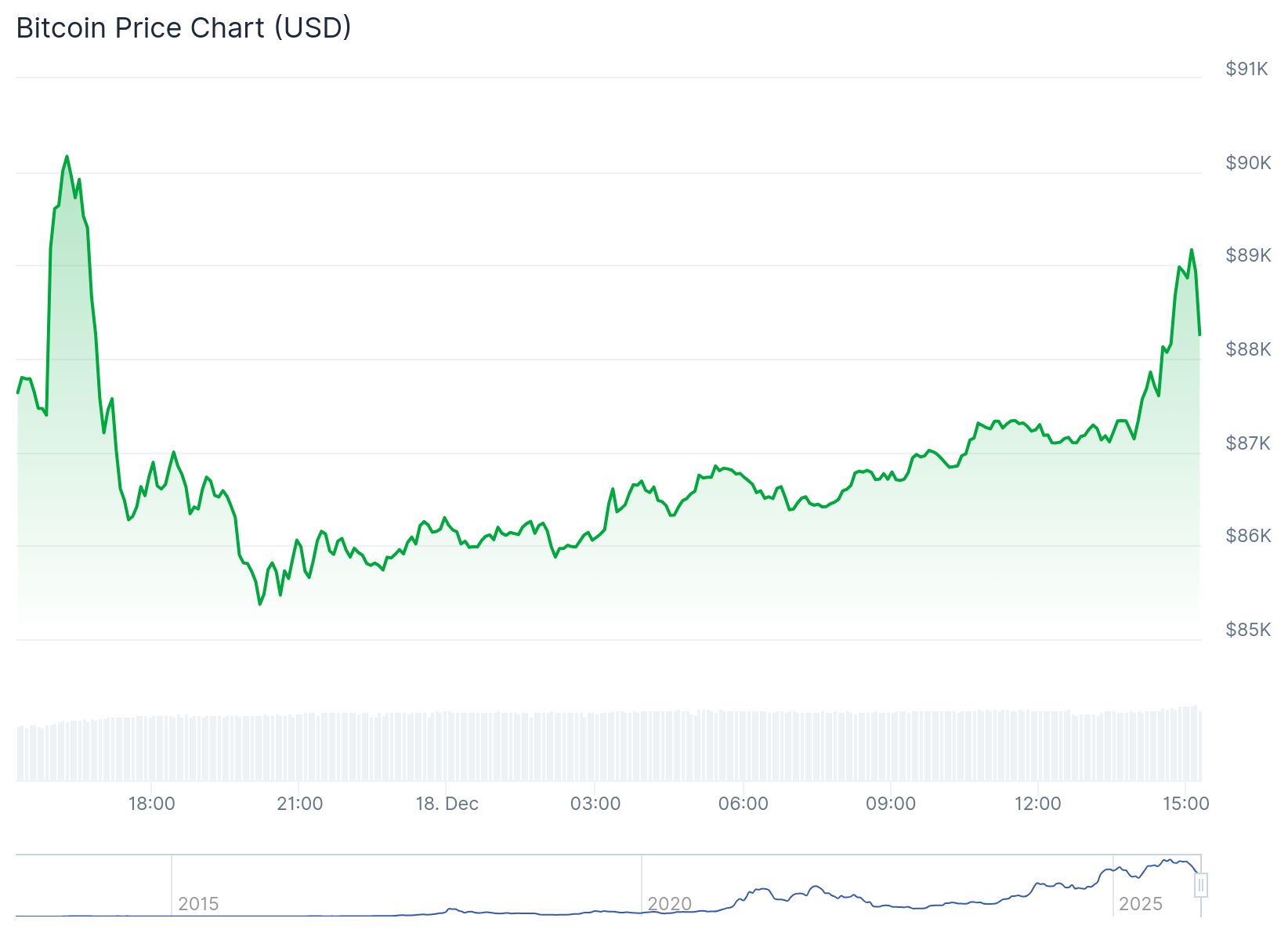 De cryptomunt stond te koop voor 87.600 dollar toen de cijfers bekend werden gemaakt. Nog geen halfuur later verscheen de 89.000 dollar op de koersborden. Dat is een sprong van 1,5 procent. En vanmorgen kon je de munt zelfs nog kopen voor iets meer dan 86.000 dollar.