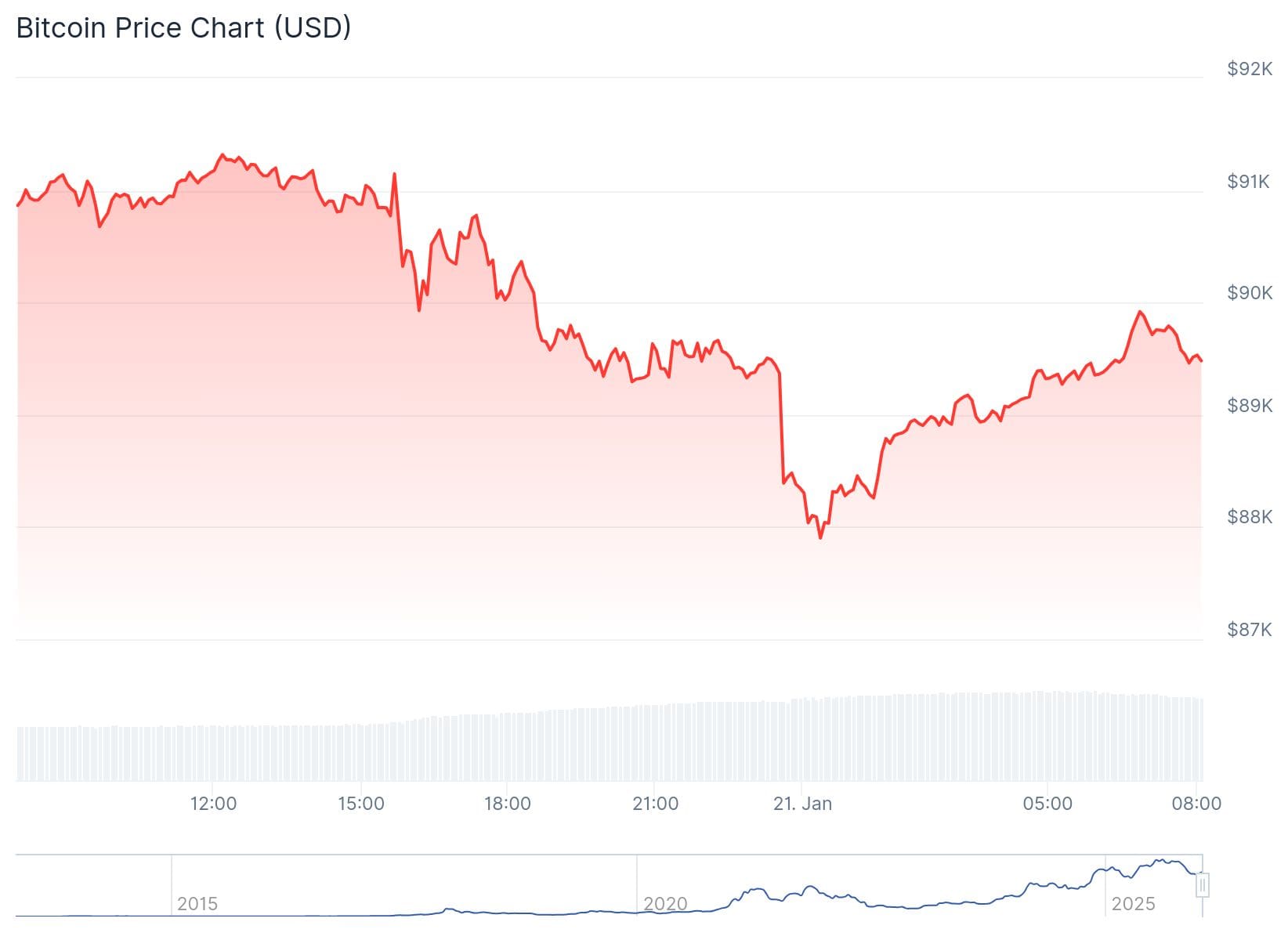 Al sinds vorige week donderdag is bitcoin aan één stuk door gedaald. Die dag stond de bitcoin koers nog boven de 97.000 dollar en gisteren werd net onder de 88.000 dollar een dieptepunt gevonden. Een totale daling van bijna 10 procent.