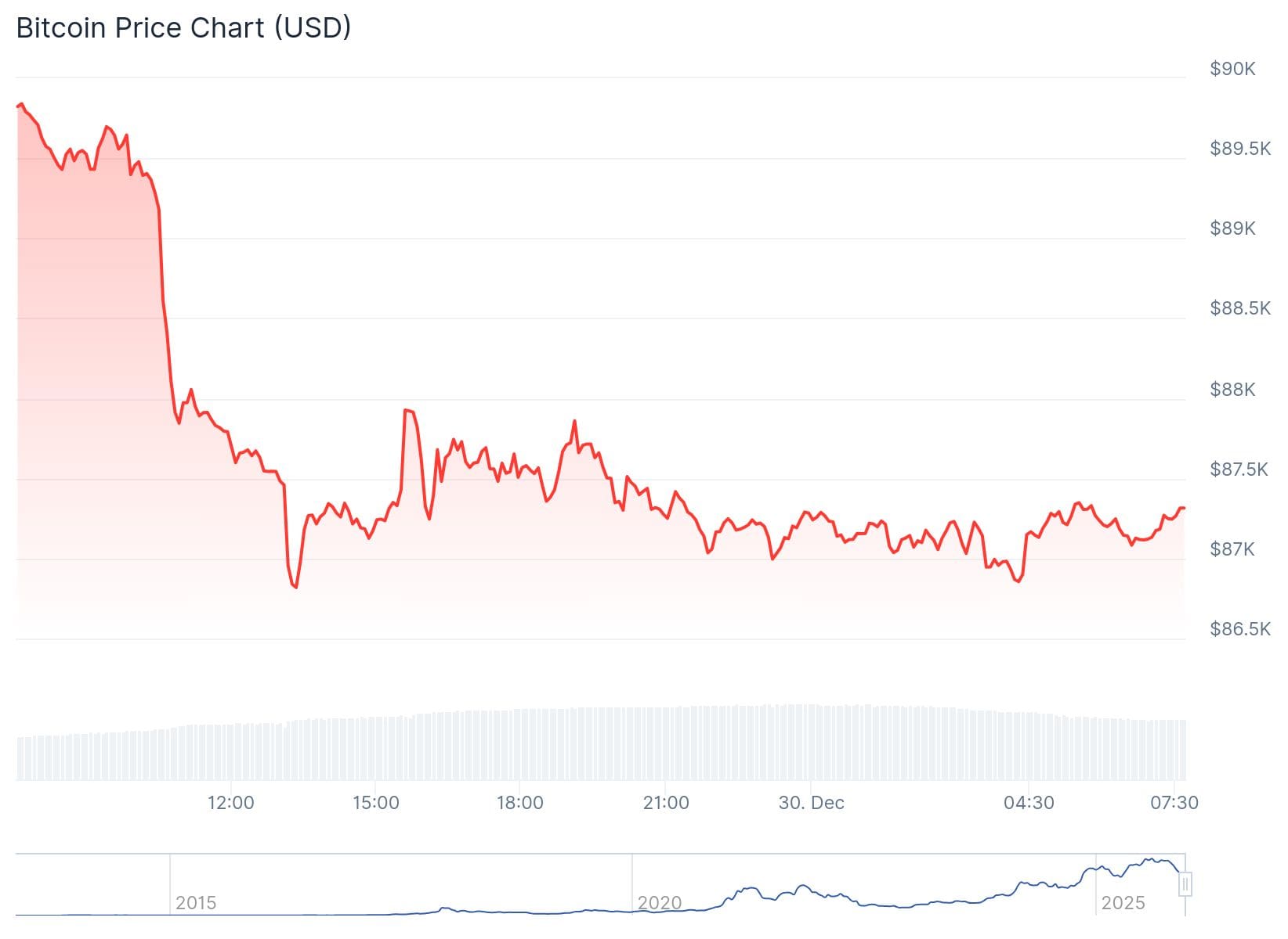 Aan het begin van de middag was de munt zelfs weer op te pikken voor minder dan 87.000 dollar en nu bungelt het net boven dat niveau.