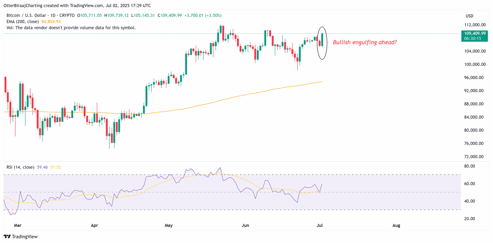 Volgens de analisten van Cointelegraph is er sprake van een bullish situatie, omdat Bitcoin boven de 108.500 dollar is gesloten, en daarmee een heel bullish patroon maakt in de grafiek.