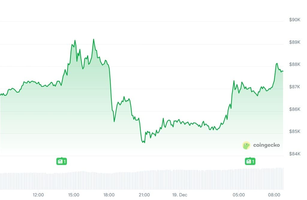 Precies op het moment dat Japan de rente verhoogde schoot bitcoin boven de 87.000 dollar. Normaal is een renteverhoging het recept voor druk op de cryptomarkt, want bitcoin beweegt vaak sterk mee met besluiten van centrale banken.