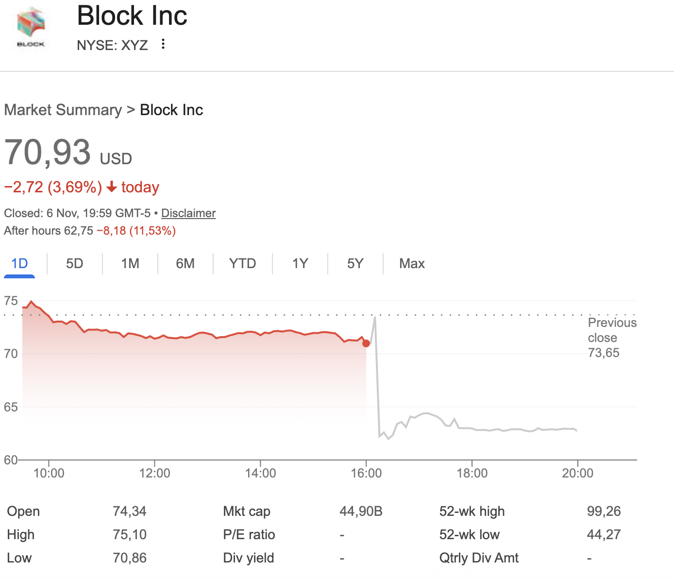 Toch reageerde de beurs teleurgesteld. Het aandeel Block (tickersymbool XYZ) daalde met 3,7 procent tot 70,94 dollar bij het sluiten van de handel en zakte daarna nog eens 11,53 procent in de nabeurshandel, tot 64,10 dollar.