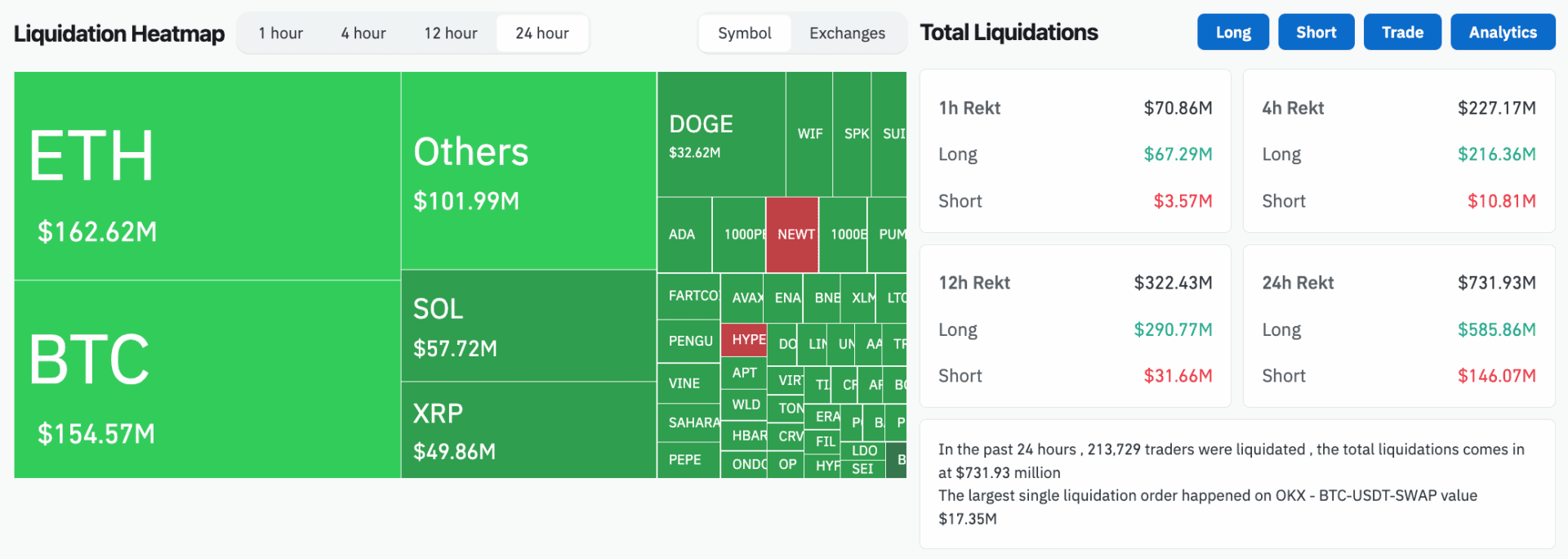 In de vroege uren van vrijdagmorgen is Bitcoin onder de 116.000 dollar gedoken. Bij dat bloedbad werden er volgens data van CoinGlass ook voor 585,86 miljoen dollar aan longposities geliquideerd. Bitcoin was goed voor 154,57 miljoen dollar aan liquidaties.