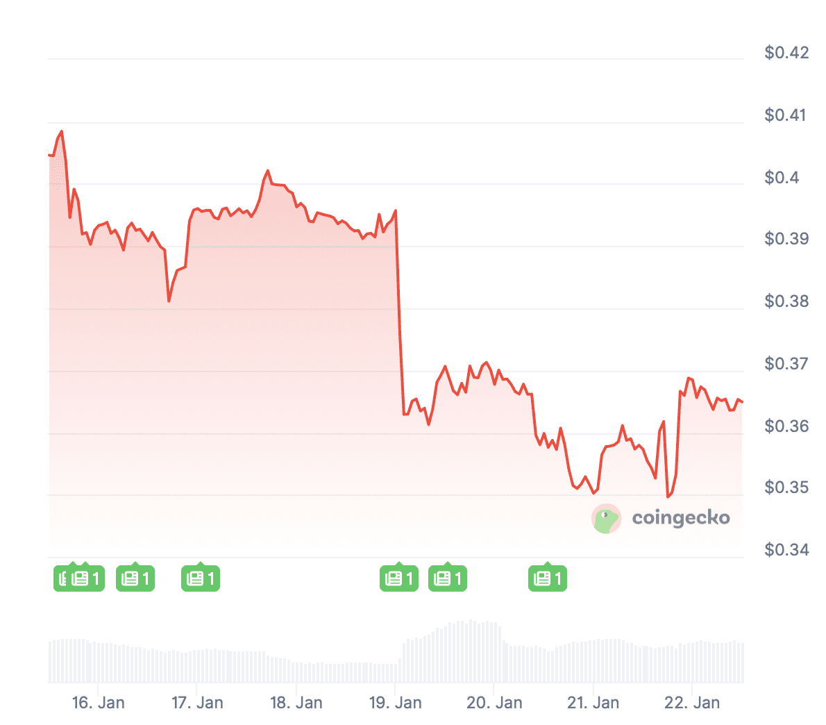 In de afgelopen zeven dagen is de koers met ongeveer 10 procent gedaald. Op het moment van schrijven is de munt 0,36 dollar waard, wat bijna 17 procent lager is dan de piek eerder deze maand.