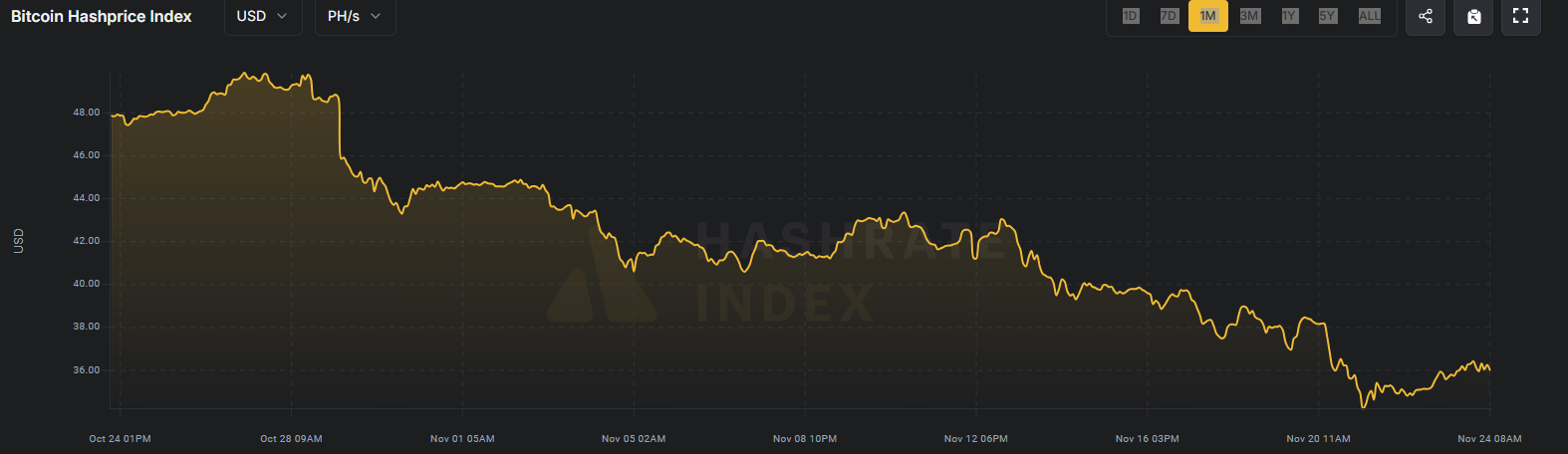 De zogenaamde “Bitcoin hashprice”, oftewel de verdiensten die miners kunnen krijgen, is de afgelopen tijd flink afgenomen. Vrijdag stond deze zelfs op 34,2 dollar PH/s, het allerlaagste niveau ooit. Een afname van deze prijs valt meestal samen met het moment dat de moeilijkheidsgraad van Bitcoin minen toe neemt. Wanneer de koers of transactiekosten stijgen neemt de hashprice juist toe.