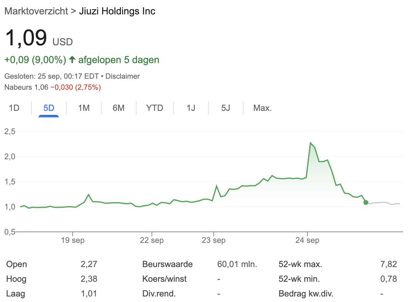 Het nieuws zorgde aanvankelijk voor een koersrally. Het aandeel Jiuzi Holdings (JZXN) schoot op 24 september omhoog tot 2,38 dollar – een stijging van ruim 46 procent ten opzichte van de slotkoers van de dag ervoor.