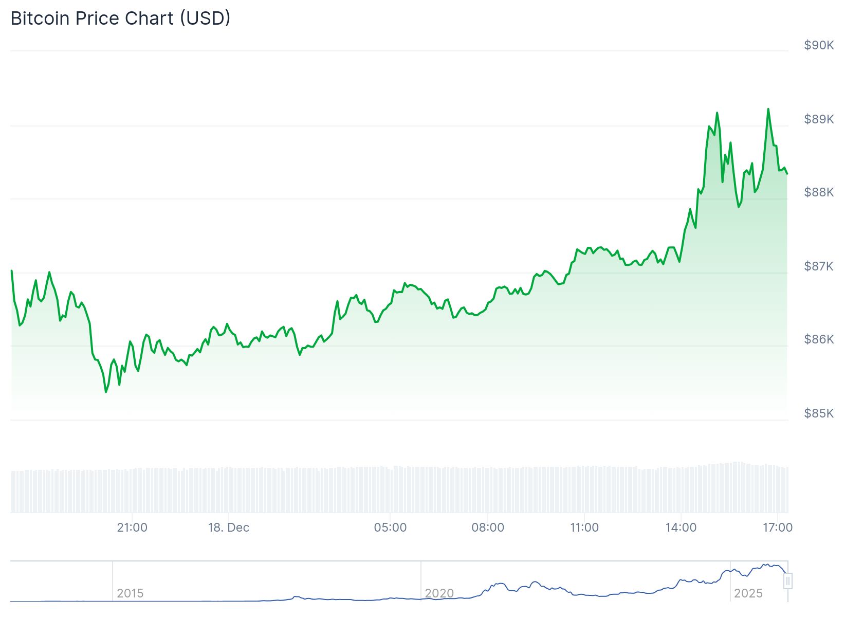 In twintig minuten schoot de koers met 1,5 procent omhoog. Bitcoin ging van 87.600 dollar naar een piek van 89.000 dollar. Daarna ging het weer vrij snel terug naar 87.800 dollar, om vervolgens een nieuw piek neer te zetten van ongeveer 89.300 dollar.