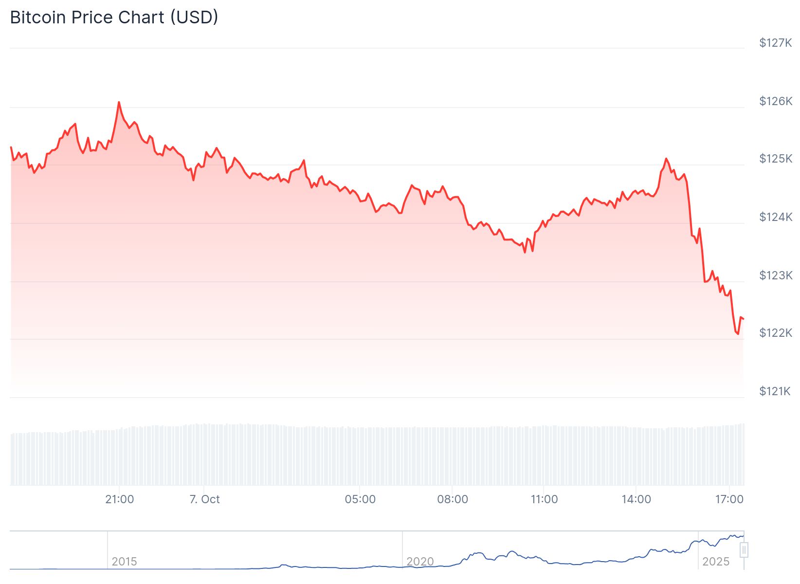 Gisteren steeg Bitcoin voor de tweede dag op rij naar een nieuw record. Rond 21:00 uur ‘s avonds werd een piek van 126.200 dollar neergezet. Daarna is de koers langzaam gaan zakken en vond het rond 10:30 uur een eerste dieptepunt van 123.500 dollar.
