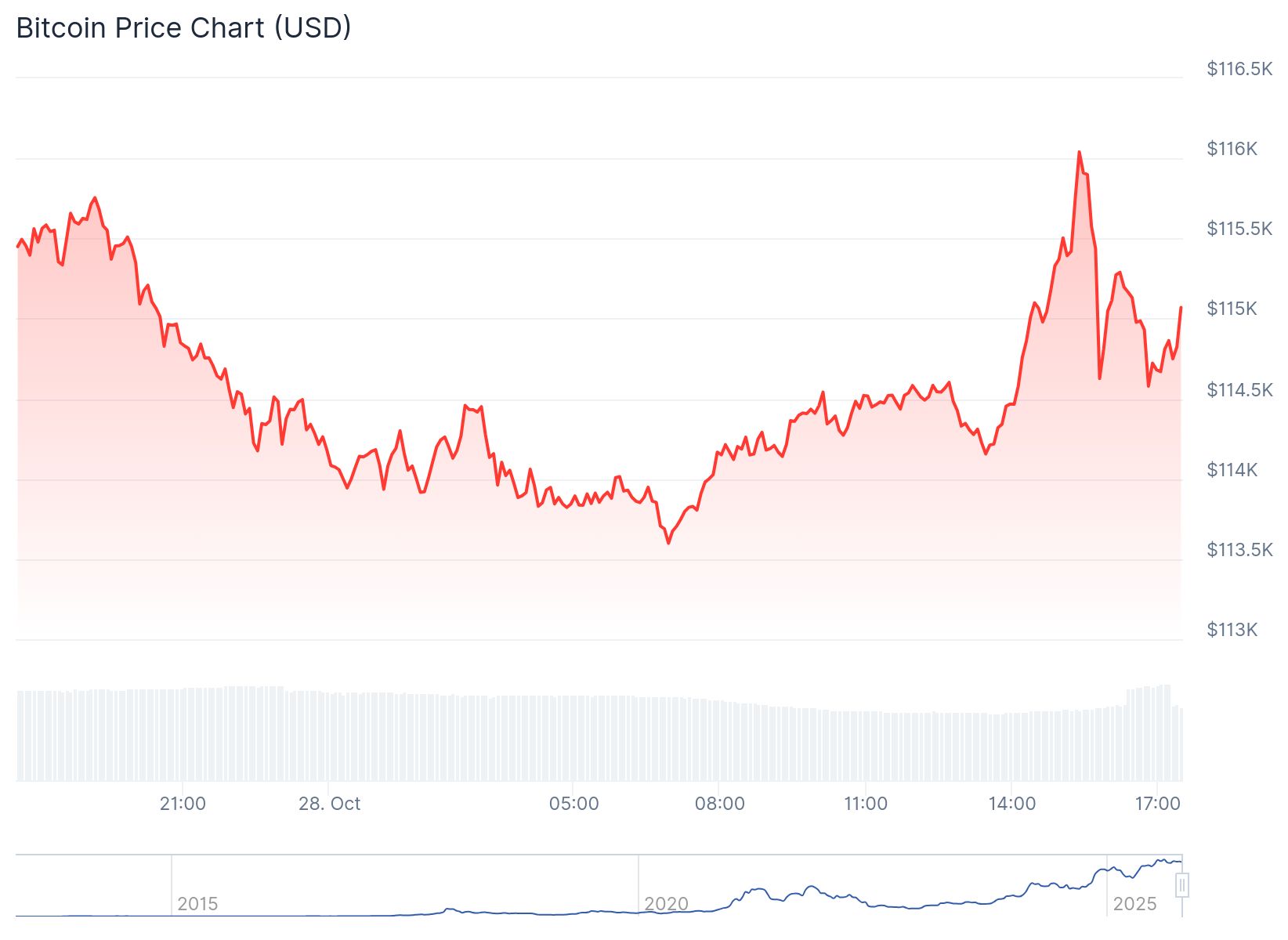 Bitcoin (BTC) heeft een hele volatiele dag vandaag. In korte tijd legde de grootste crypto een indrukwekkende stijging tot 116.000 dollar, maar voor de derde keer in anderhalve dag werd de koers hier genadeloos afgewezen.