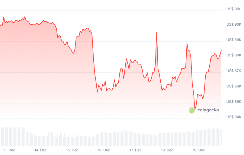 De cryptokoersen staan vandaag in het rood met een 0,3 procent daling in totale marktwaarde. De grootste cryptomunt bitcoin volgt de markttrend voorzichtig en is met ongeveer 0,3 procent gedaald. Hierdoor staat de koers momenteel op 88.000 dollar en komt het voor de zoveelste keer deze week net niet in de buurt van de 90.000 dollar. Deze week is bitcoin al drie keer afgewezen toen het in de buurt kwam van deze grens. Meerdere analisten stellen daarom ook dat bitcoin momenteel vast zit.
