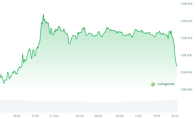Gisteravond wist de koers nog boven de 93.000 dollar uit te komen maar zakte daarna weer snel terug naar 92.000 dollar. Vandaag was de koers stabiel gebleven rond dit niveau maar schiet deze nu hard naar beneden. De markt komt daarmee toch niet helemaal op adem en zet de enerverende trend van deze week voort.