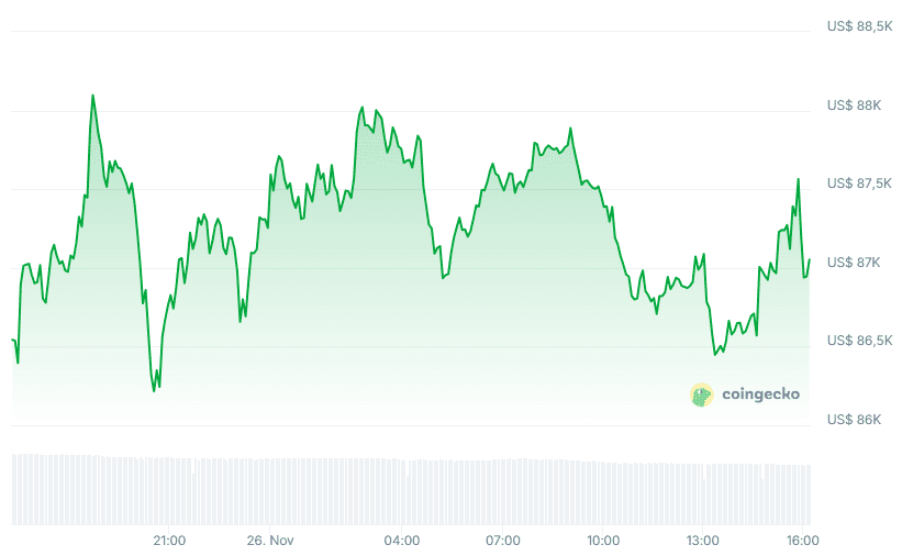 Toch liet de koers vandaag aardig wat volatiliteit zien (binnen beperkte marges), zoals onderstaande grafiek duidelijk maakt. De koers steeg in de afgelopen 24 uur meerdere keren richting de grens van 88.000 dollar maar werd hier herhaaldelijk afgewezen.