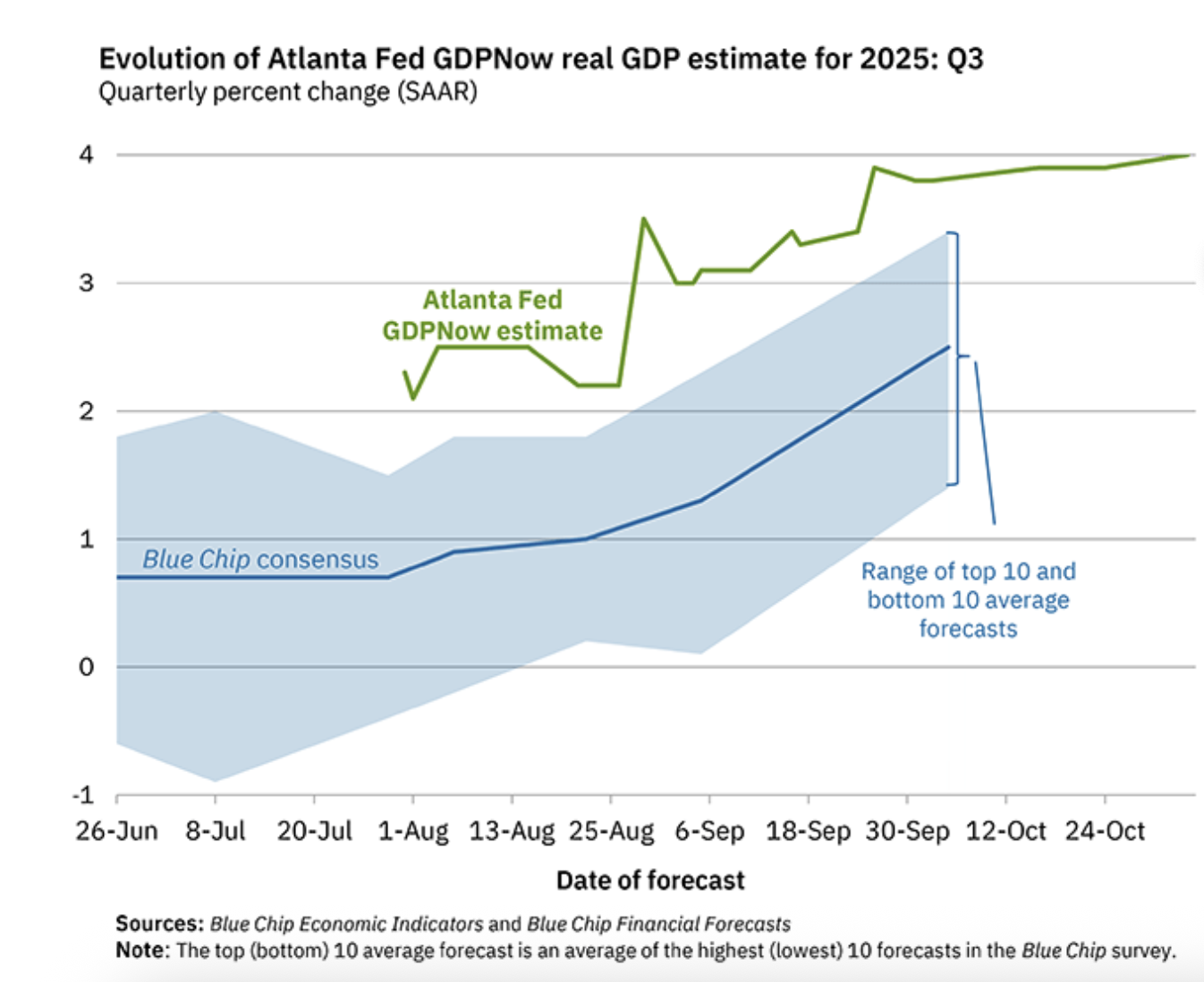 Hoewel de markt enorm wisselvallig presteert, blijft het fundament voor Bitcoin heel sterk. Zo geeft het GDPNow-model van de Atlanta Fed sinds gisteren aan dat de economische groei voor het derde kwartaal van 2025 op 4,0 procent wordt geschat.