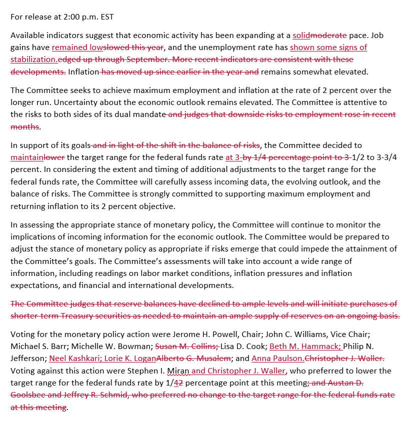 De stemming was 10-2 voor het ongewijzigd laten van de rente. Christopher Waller stemde opnieuw vóór een renteverlaging en blijft zich daarmee profileren als uitgesproken duif; iemand die voor renteverlagingen is.