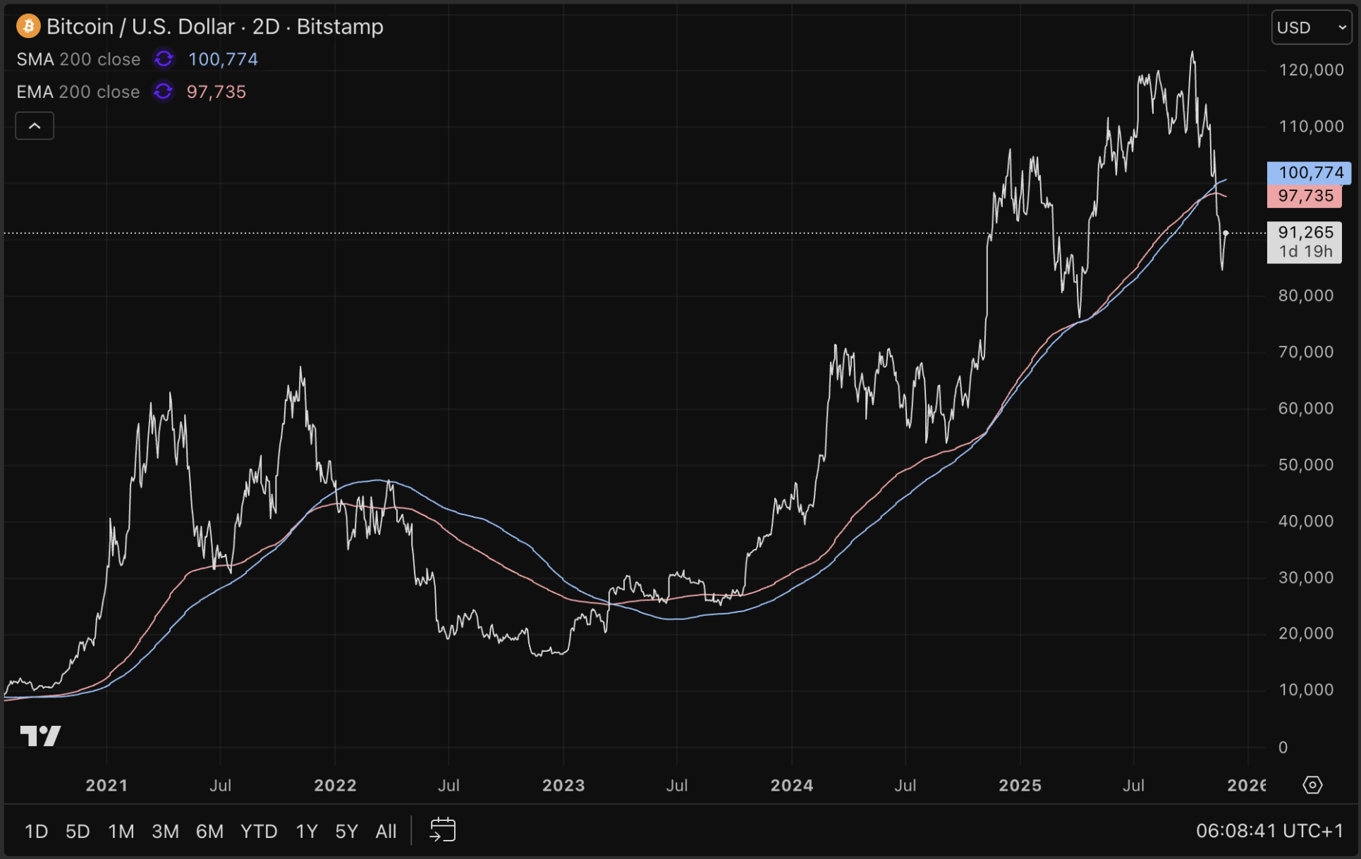 Vanuit technisch perspectief heeft Bitcoin nog een lange weg te gaan. Veel handelaren kijken naar belangrijke bewegende koersgemiddelden, die in het verleden een scheidslijn waren tussen bull- en bearmarkten.