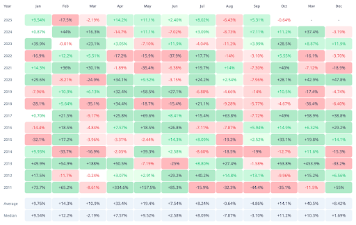 Ondanks het bloedbad van begin oktober blijft de bijnaam ‘Uptober’ volgens Melker overeind staan. Historische data laten zien dat Bitcoin in oktober gemiddeld met ongeveer 14 procent stijgt.