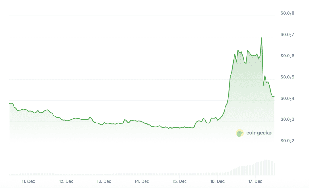 Binnen 24 uur steeg de koers van 0,0032 dollar naar een piek van 0,0069 dollar – meer dan een verdubbeling.  Het was gisteren één van de sterkste koersstijgingen op de cryptomarkt.