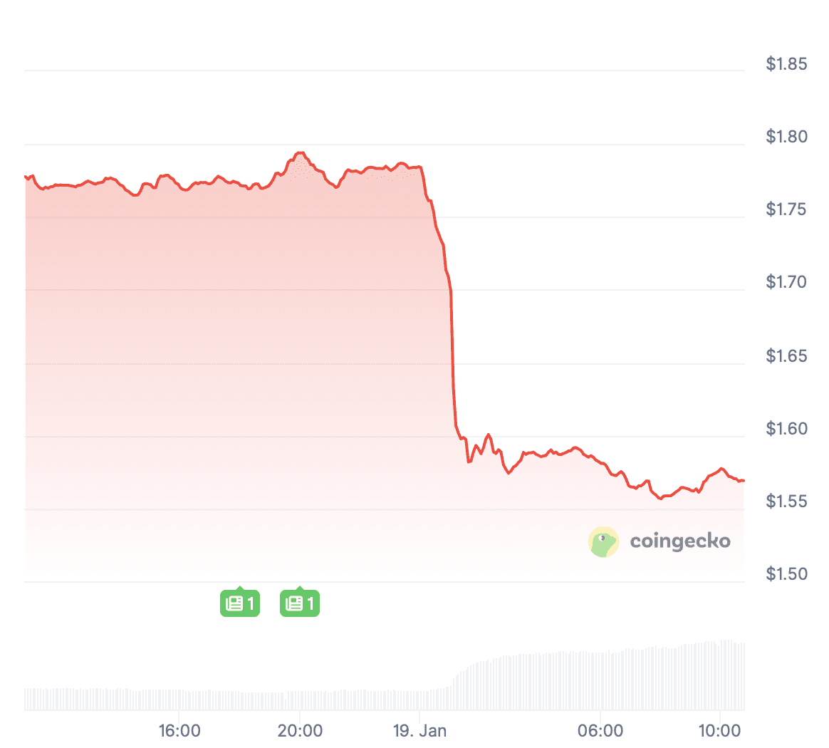 De koers van sui bereikte vannacht een dieptepunt rond 1,52 dollar, waarna de koers weer iets is gestegen. Op het moment van schrijven is sui 1,57 dollar waard, waardoor de uiteindelijke koersdaling van de afgelopen 24 uur op iets minder dan 12 procent uitkomt.