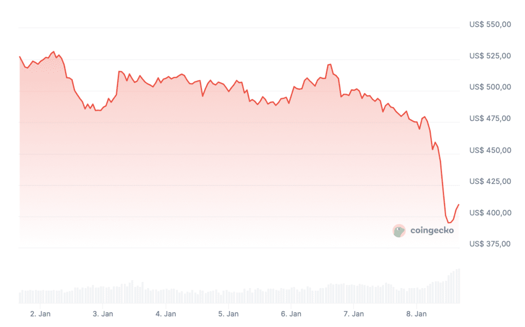 De Zcash-markt kreeg donderdag plotseling flinke klappen te verduren, toen de koers opeens omlaag kelderde van 479,42 dollar naar 394,85 dollar.