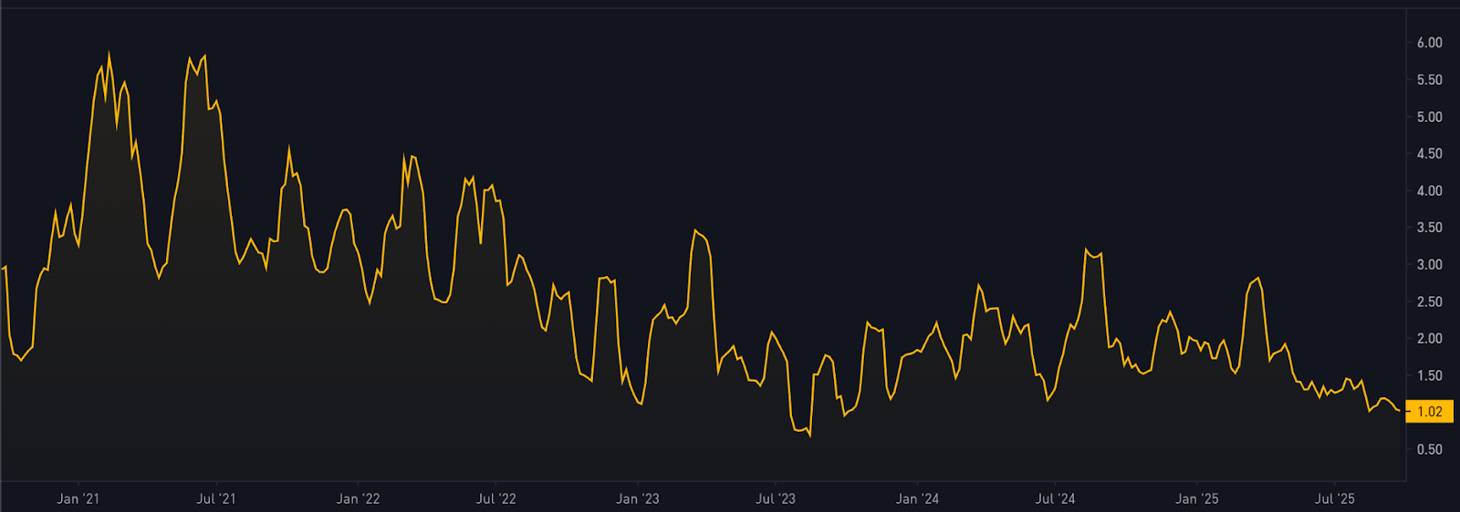Dat beeld wordt bevestigd door de Bitcoin Volatility Index, die meet hoe sterk de prijs schommelt binnen een periode van 30 dagen. De trend is duidelijk: BTC wordt minder grillig, en dus aantrekkelijker als stabiele waardeopslag.