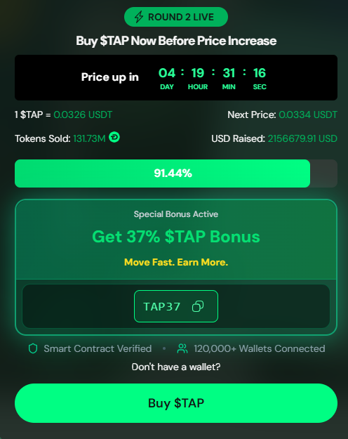 Met een huidige prijs van $0,0326 is de instapprijs van $TAP aantrekkelijk voor beleggers die op zoek zijn naar een hoog rendement terwijl de bredere cryptomarkt daalt. Meer dan 131 miljoen $TAP-tokens zijn al verkocht, wat minstens $2,1 miljoen heeft opgeleverd. De prijs zal in de volgende fase stijgen naar $0,0334.