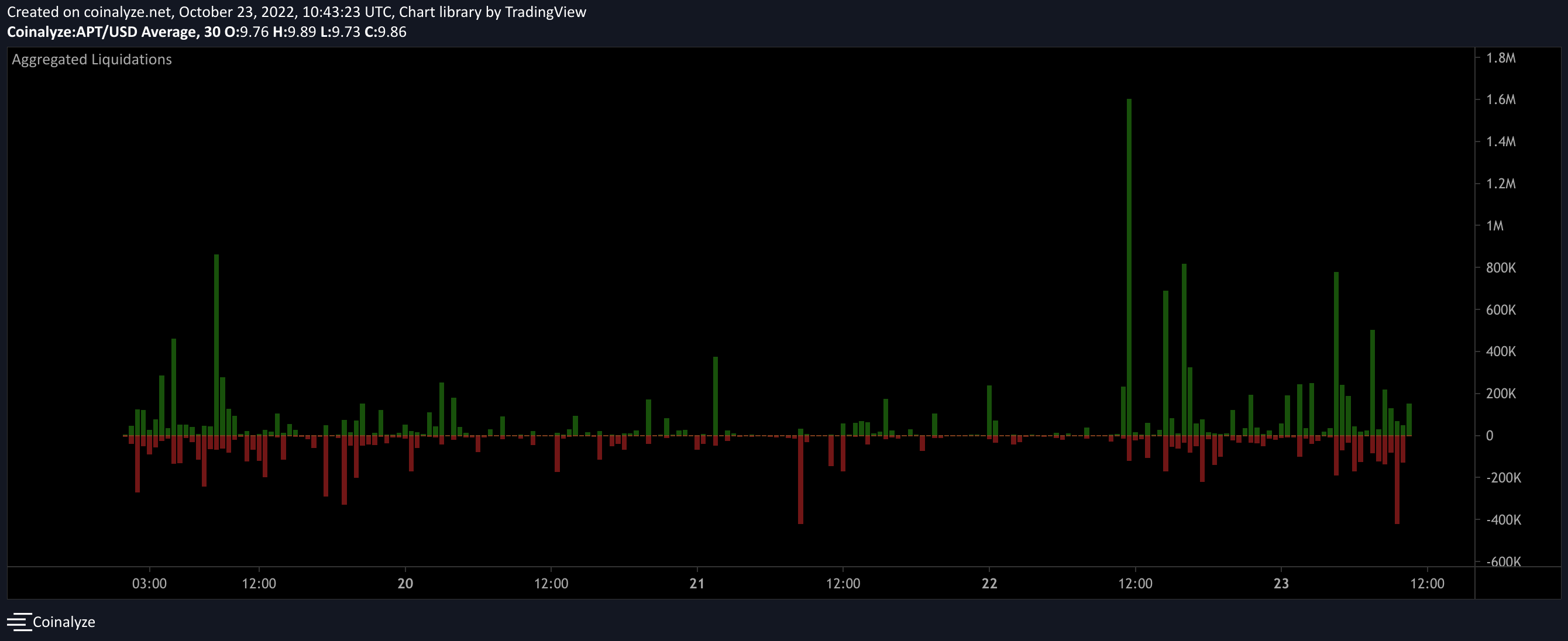 Ook bij APT was dit het geval. Een short squeeze deed APT stijgen van een prijs van $7,44 naar een top van $10,12, aldus data van CoinGecko. Door de negatieve funding rate werd duidelijk dat een short squeeze de waarschijnlijke reden voor de stijging was. Op het moment van schrijven is APT weer iets in waarde gedaald.