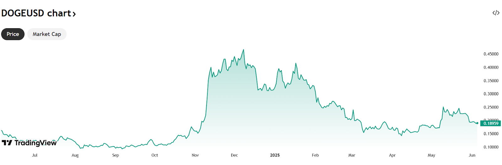Dogecoin koers 1 jaar – Bron: TradingView