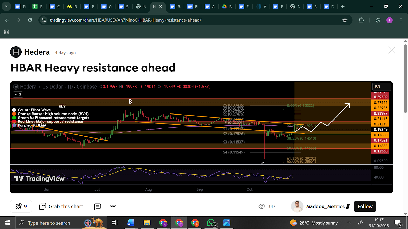 De HBAR-prijs bleef rond $0,19 hangen na een stevige wekelijkse stijging, wat aantoont dat kopers de dips benutten in plaats van blindelings het momentum te volgen.