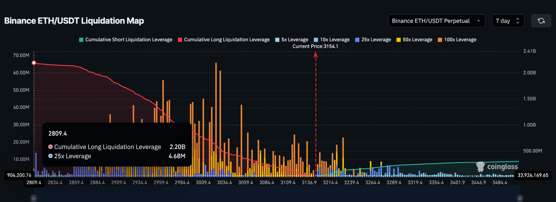 Dat maakt de markt gevoelig: zelfs een beperkte daling kan een kettingreactie aan liquidaties veroorzaken. De zwaarste liquidatiezone ligt tussen 3.150 en 2.850 dollar. Dat gebied fungeert al weken als steun, maar bij toenemende druk kan die steun snel breken.