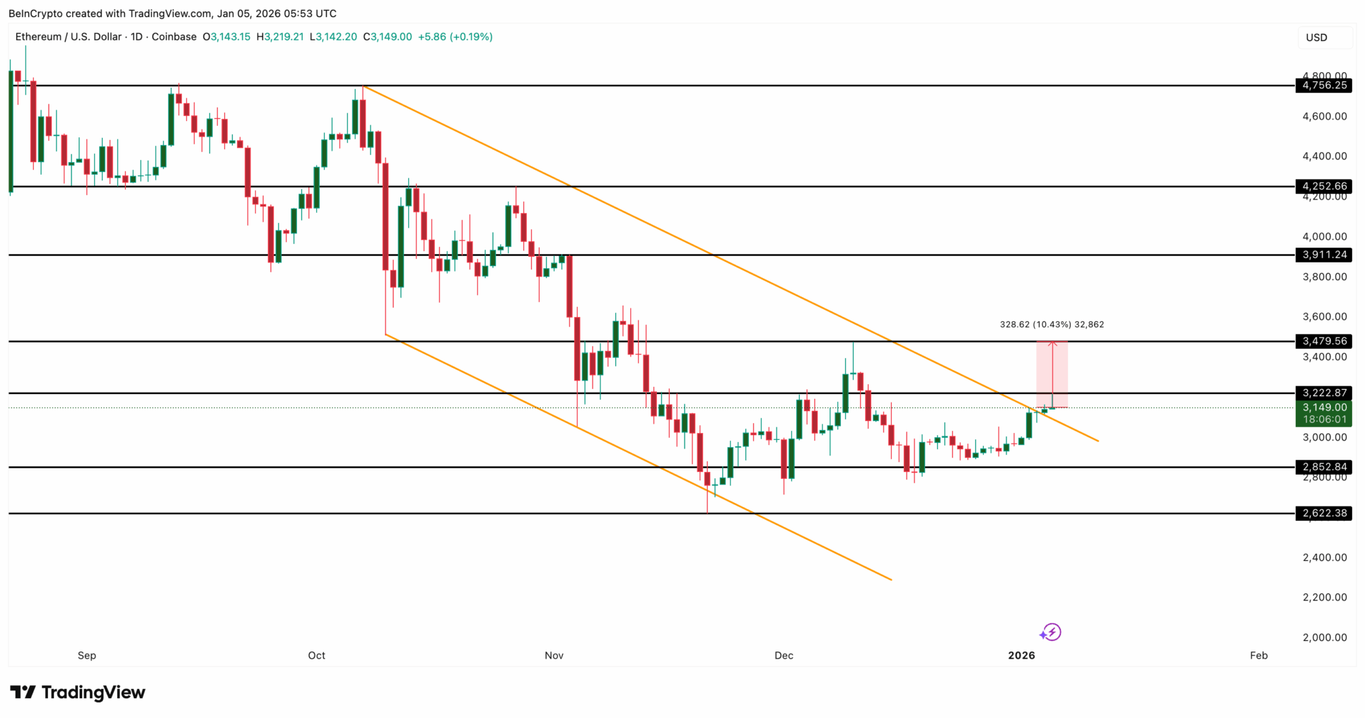 Sinds begin oktober bewoog Ethereum binnen een dalend kanaal, waarbij elke opleving lager eindigde dan de vorige. Die structuur is deze week doorbroken. Dat is technisch gezien een belangrijke stap, omdat het wijst op afnemende verkoopdruk.