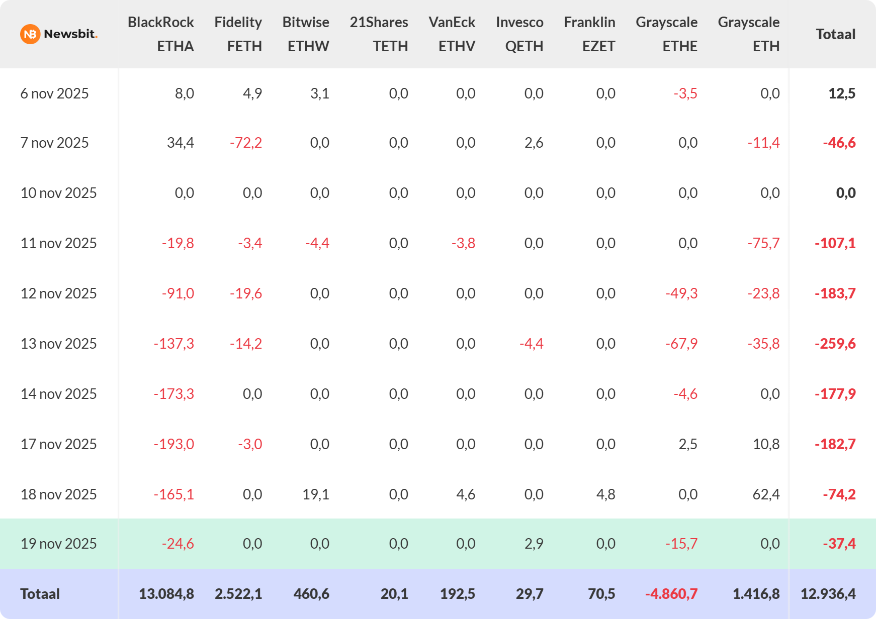 Wat de situatie volgens Brown nog nijpender maakt, is de aanhoudende uitstroom van kapitaal uit de Amerikaanse ETH spot exchange-traded funds (ETF’s). De afgelopen zeven dagen waren er uitsluitend uitstromen te zien, met een totaalbedrag van ruim 985 miljoen dollar.