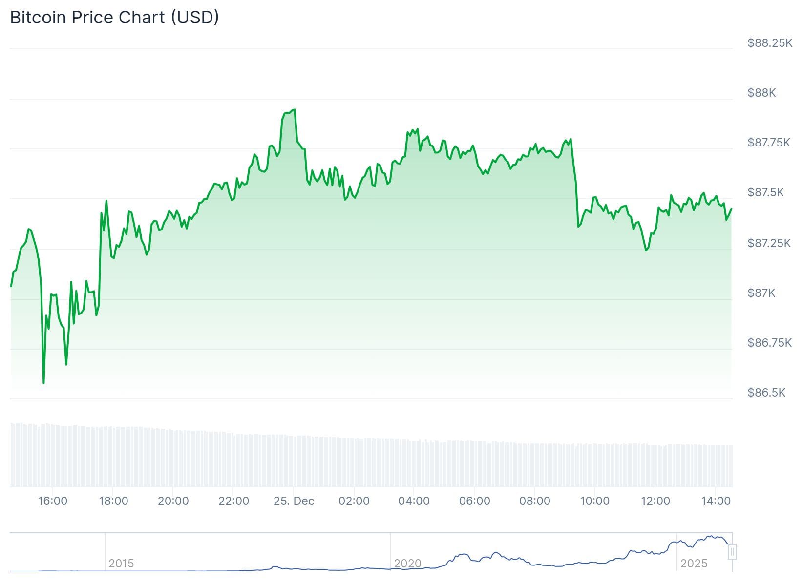 Dat het rustig is, mag geen verrassing heten. Er wordt vandaag een stuk minder gehandeld en dat zie je direct terug in de grafieken. Bitcoin verveelt zich zichtbaar en dobbert rond de 87.500 dollar.