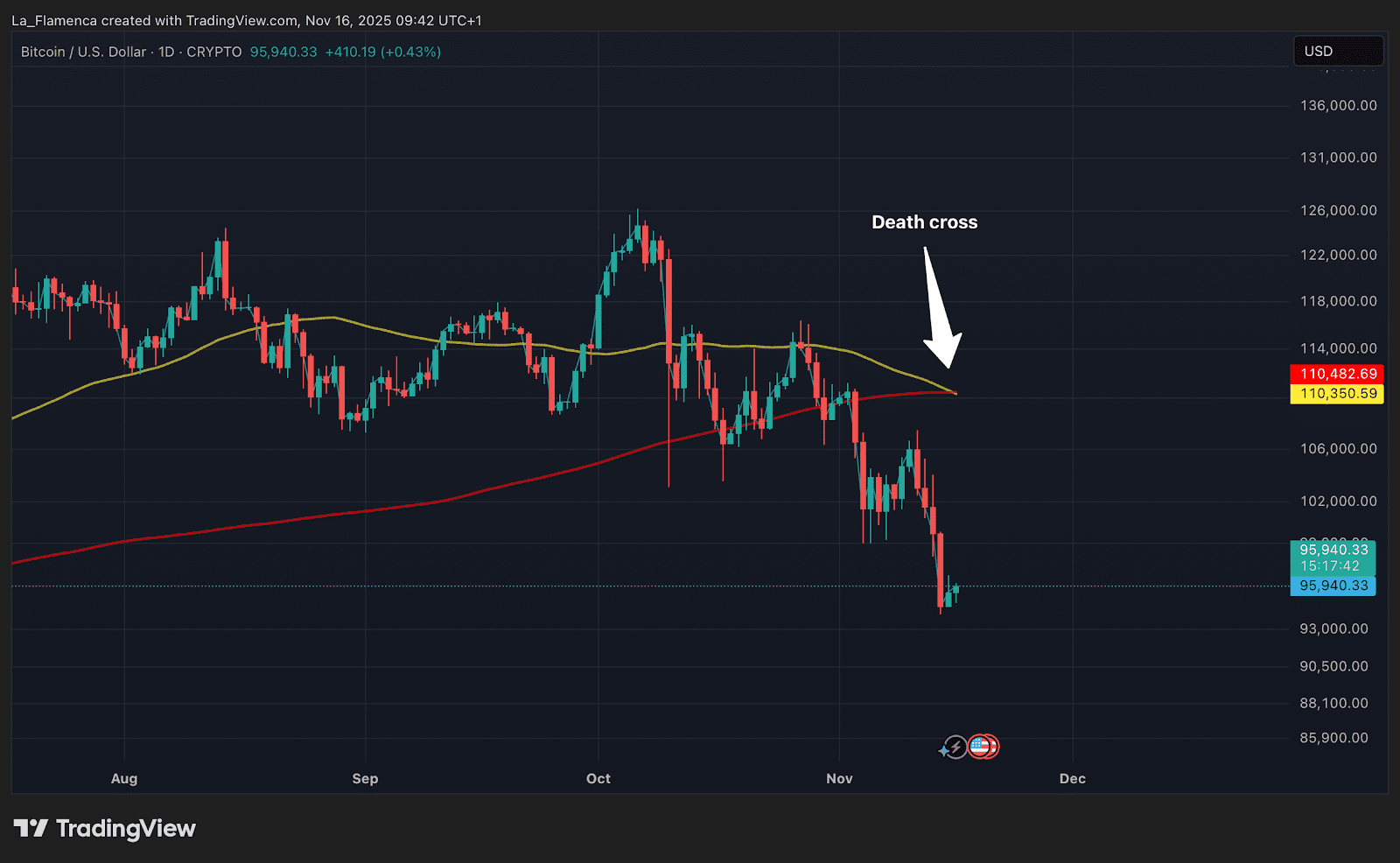 In de dagelijkse koersgrafiek van bitcoin is er een wel heel bearish (negatief) teken verschenen. Het gaat om een zogeheten death cross (doorkruising des doods), wat vaak een voorbode is van prijsdaling.
