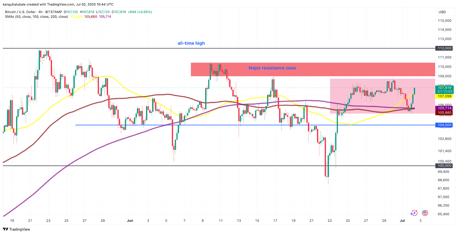 Veel handelaren wachten mogelijk nog op een definitieve bevestiging van de uitbraak. Op dit moment handelt Bitcoin immers in zijn “vaste koersbereik” van 105.000 tot 108.800 dollar. Daar zit de koers al sinds 25 juni in vast.